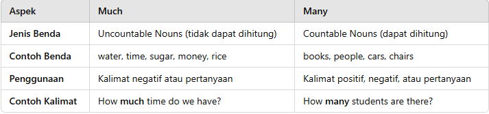 Secara sederhana, “much” dan “many” keduanya berarti “banyak”, namun penggunaannya tergantung pada jenis kata benda yang mereka modifikasi. Much digunakan untuk kata benda yang tidak dapat dihitung (uncountable nouns), sedangkan many digunakan untuk kata benda yang dapat dihitung (countable nouns).